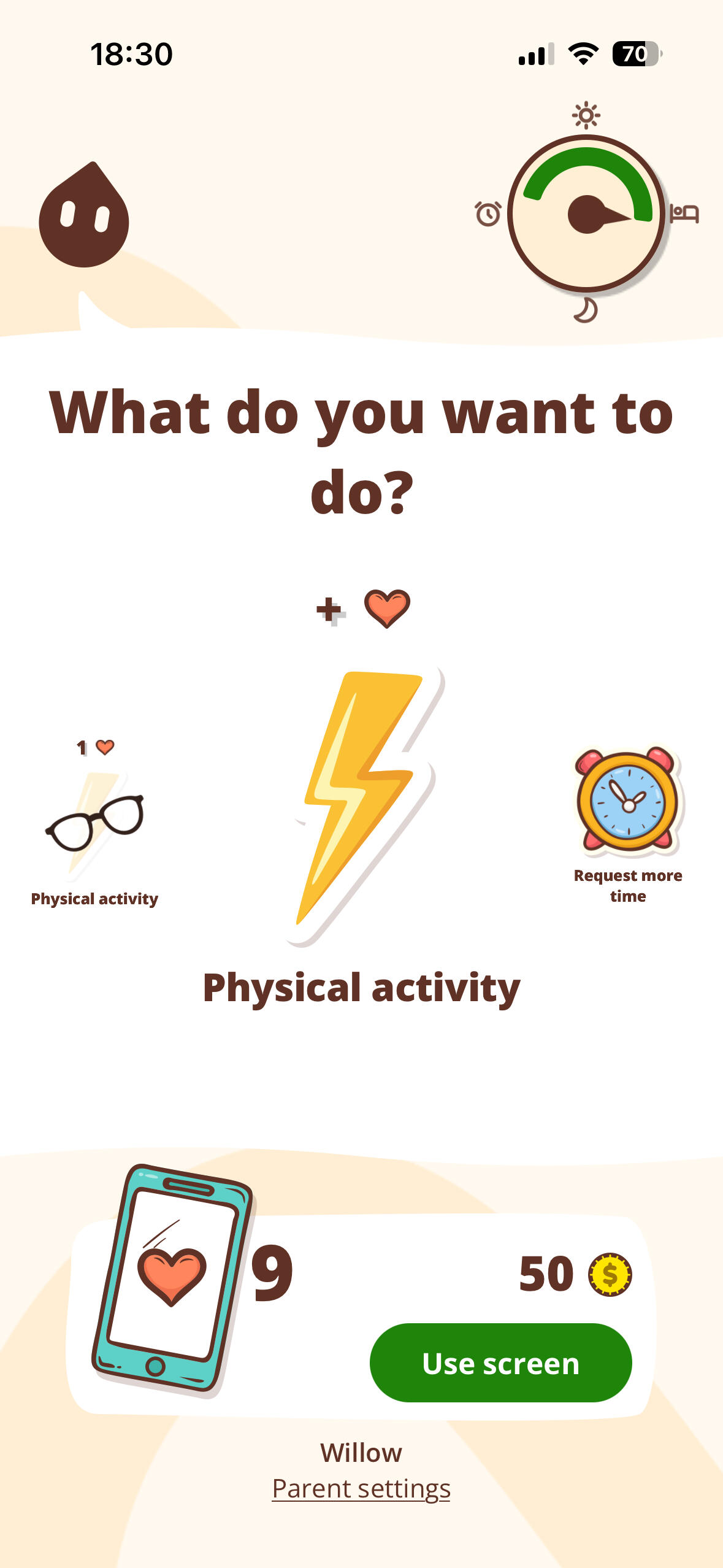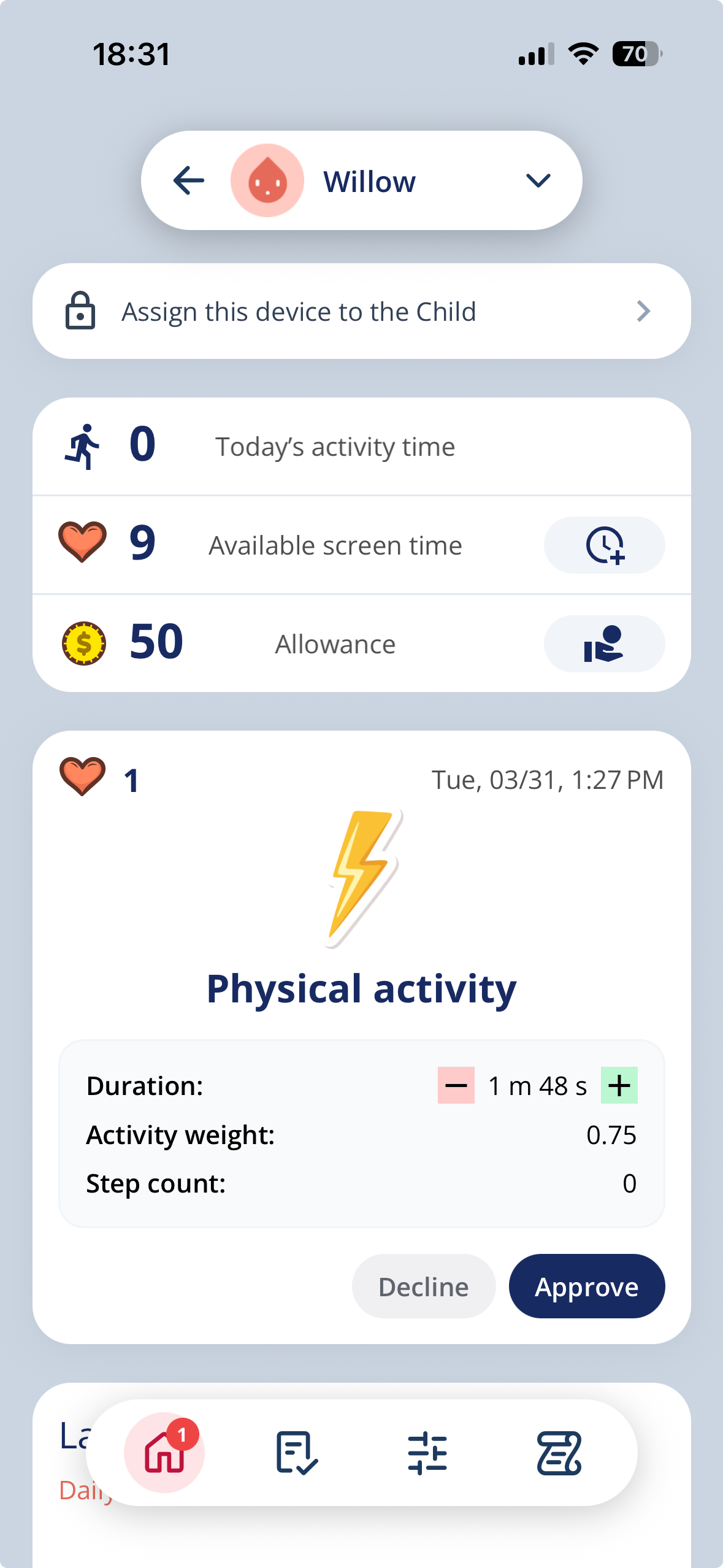Track challenge participation and earned screen time.